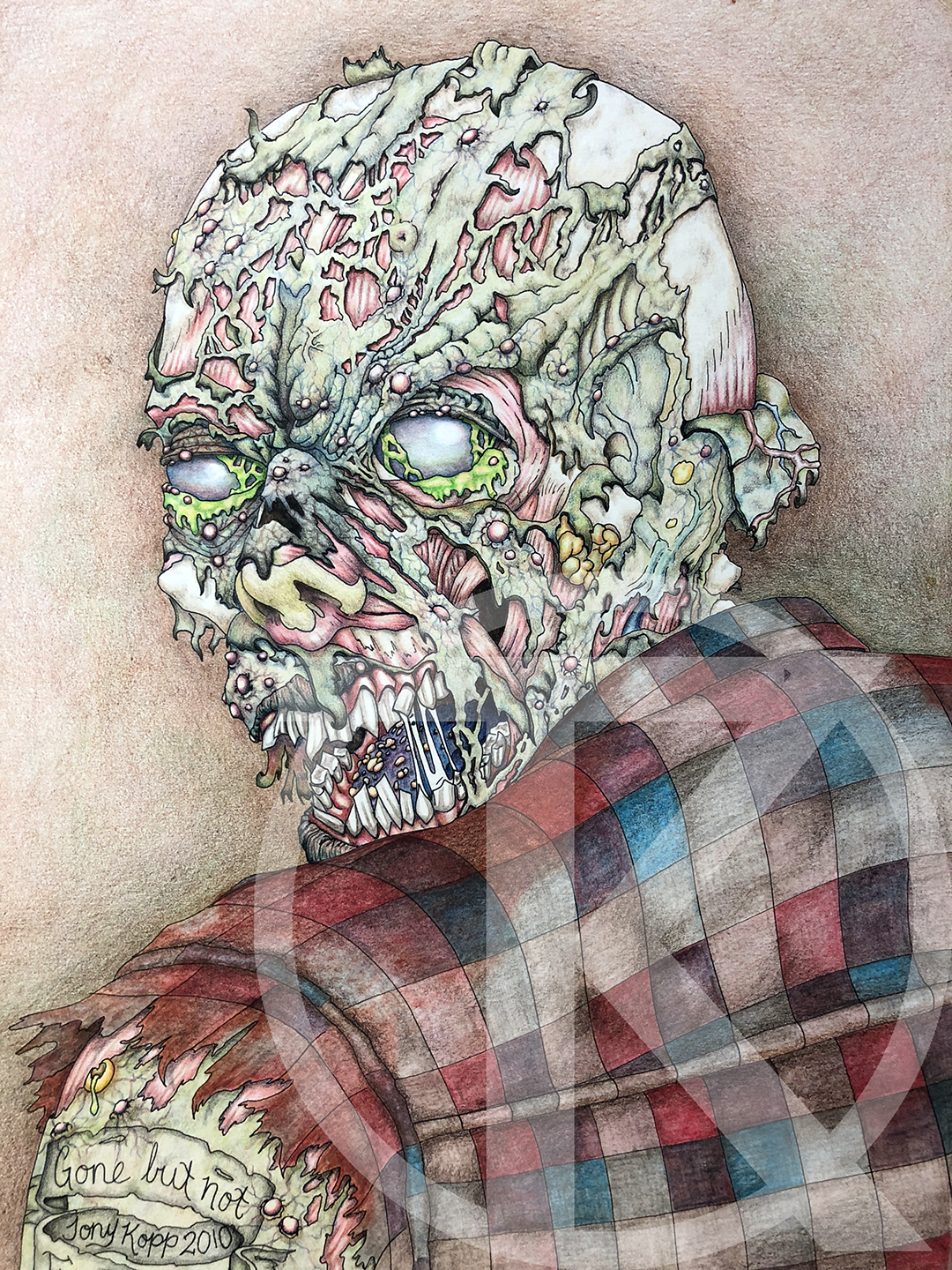 A detailed, colored illustration of a zombie with decayed skin, glowing eyes, and exposed teeth, wearing a red and gray plaid shirt. A tattoo on its arm reads, 'Gone but not forgotten - Tony Kopp 2010.'