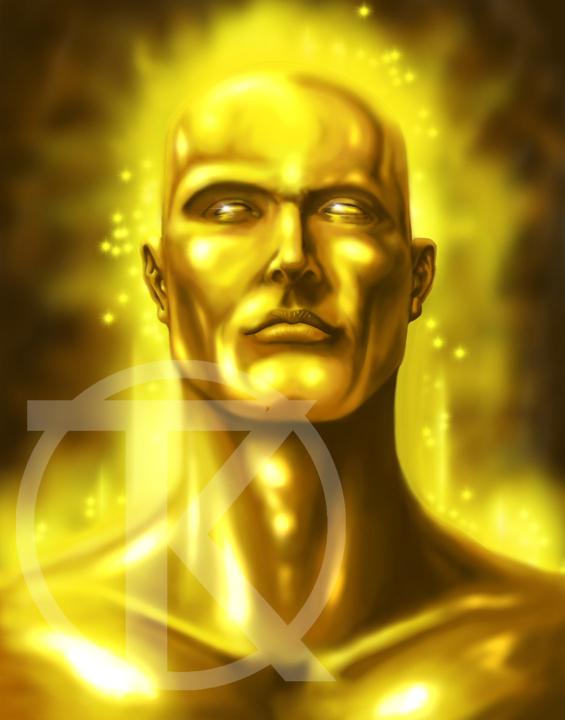 A golden, metallic bust of a human face and shoulders with glowing effects, surrounded by stars and glowing light.